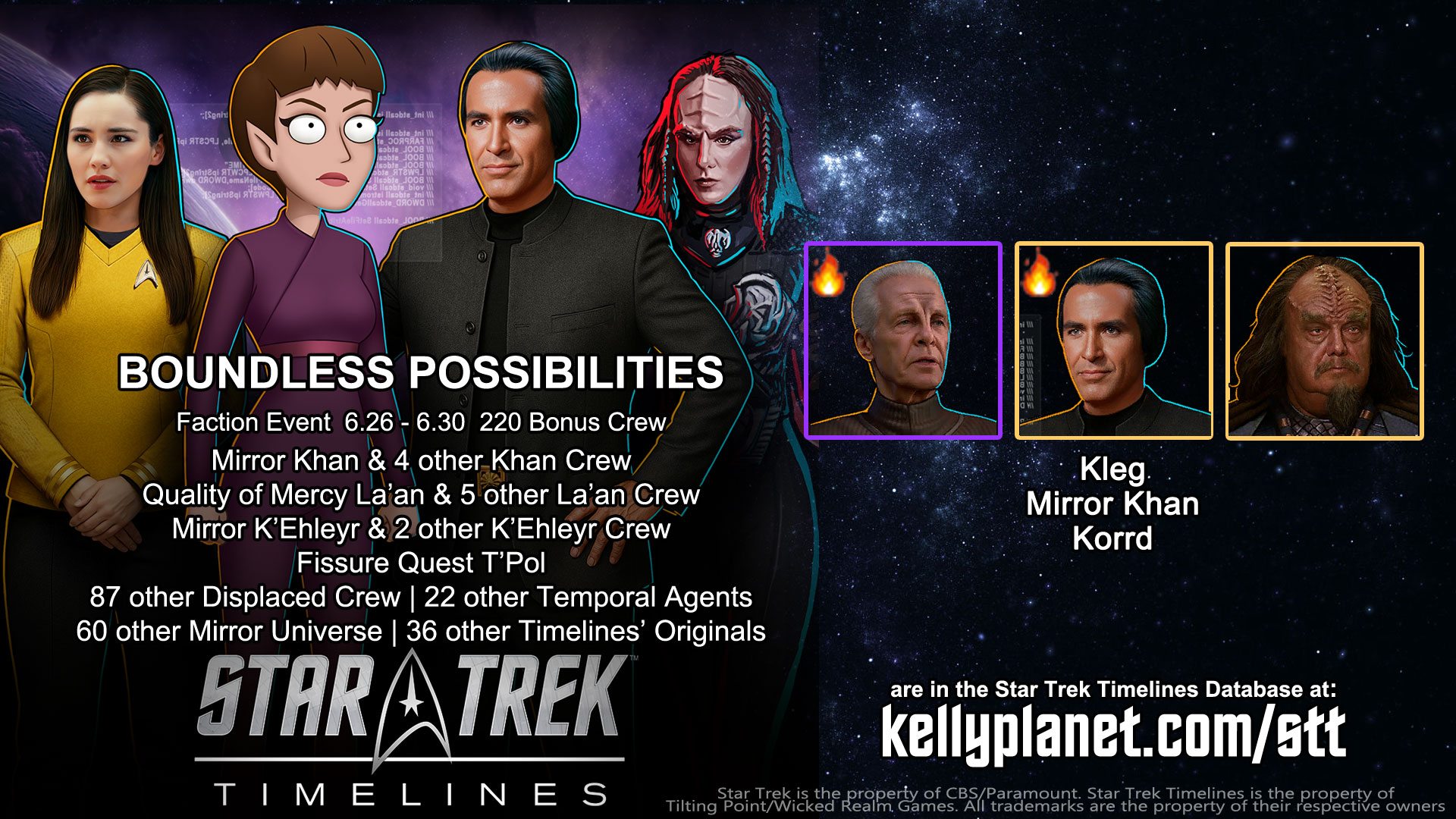Faction Event: BOUNDLESS POSSIBILITIES 6.26 – 6.30 | 220 Bonus Crew – see them all at https://kellyplanet.com/star-trek-timelines/event-bonus-crew : MIrror Khan & 4 other Khan Crew | Quality of Mercy La’an & 5 other La’an Crew | Mirror K’Ehleyr & 2 other K’Ehleyr Crew | Fissure Quest T’Pol | 87 other Displaced Crew | 22 other Temporal Agent Crew | 60 other Mirror Universe Crew | 36 other Timelines’ Originals Crew