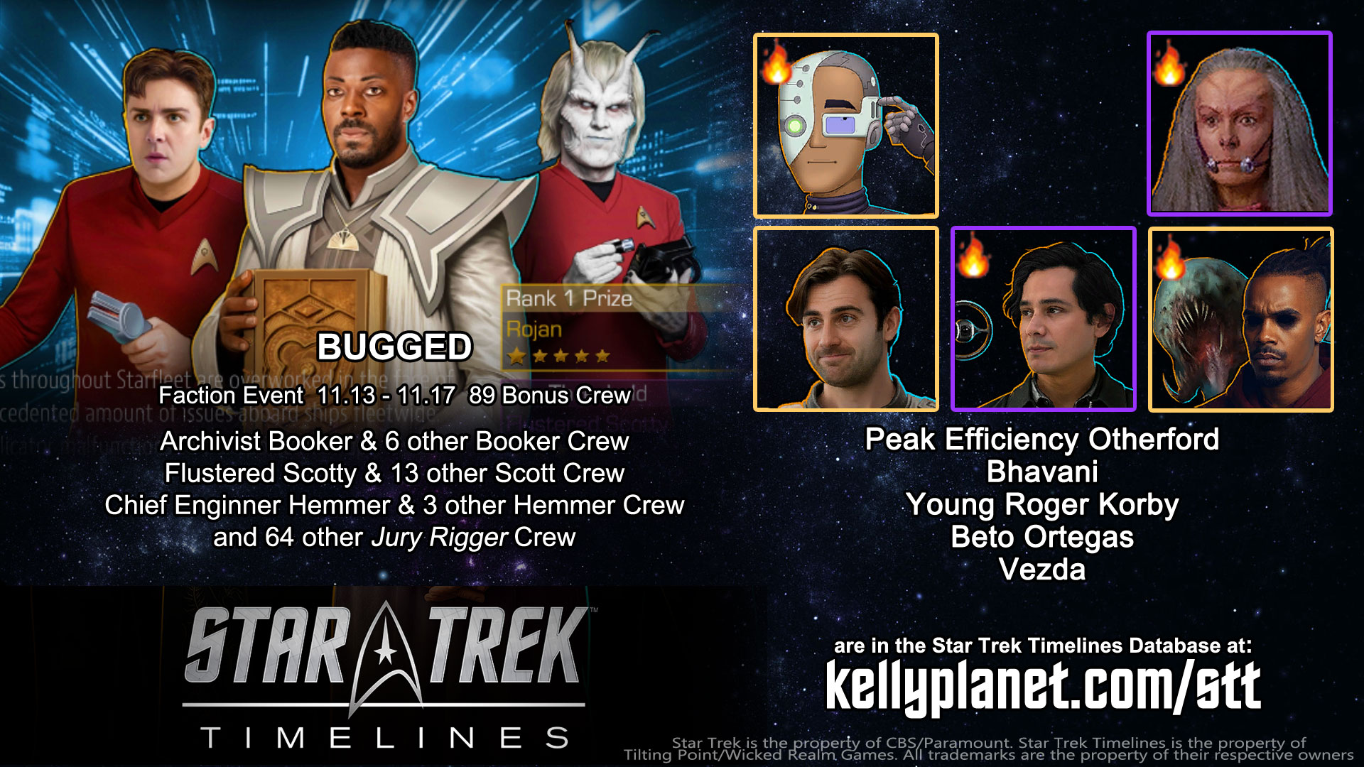Faction Event: BUGGED 11.13 – 11.17 | 89 Bonus Crew – see them all at https://kellyplanet.com/star-trek-timelines/event-bonus-crew : Archivist Booker & 6 other Booker Crew | Flustered Scotty & 13 other Scott Crew | Chief Engineer Hemmer & 3 other Hemmer Crew | and 64 other Jury Rigger Crew.