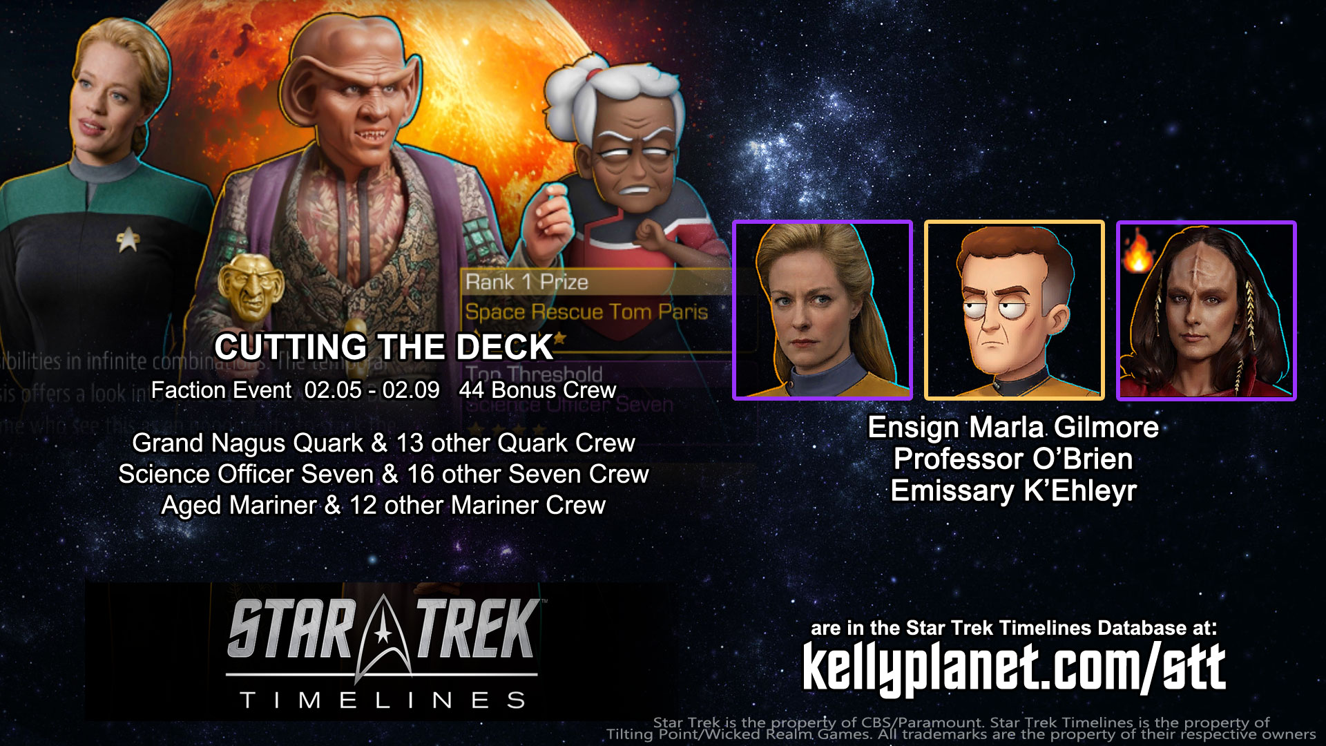 Faction Event: CUTTING THE DECK | 02.05 – 02.09 | 44 Bonus Crew – see them all at https://kellyplanet.com/star-trek-timelines/event-bonus-crew : Grand Nagus Quark & 13 other Quark Crew | Science Officer Seven & 16 other Seven Crew | Aged Mariner & 12 other Mariner Crew