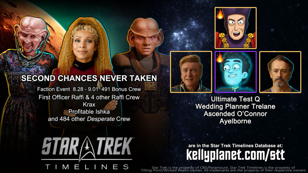 Faction Event: SECOND CHANCES NEVER TAKEN 8.28 – 9.01 | 491 Bonus Crew – see them all at https://kellyplanet.com/star-trek-timelines/event-bonus-crew : First Officer Raffi & 4 other Raffi Crew | Krax | Profitable Ishka | and 484 other Desperate Crew.
