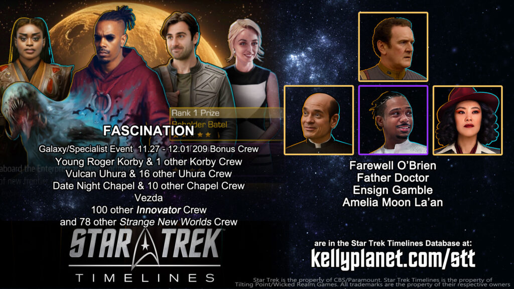 Galaxy/Specialist Event: FASCINATION 11.27 – 12.01 | 209 Bonus Crew – see them all at https://kellyplanet.com/star-trek-timelines/event-bonus-crew : Young Roger Korby & 1 other Korby Crew | Vulcan Uhura & 16 other Uhura Crew | Date Night Chapel & 10 other Chapel Crew | Vezda | 100 other Innovator Crew and 78 other Strange New Worlds Crew.