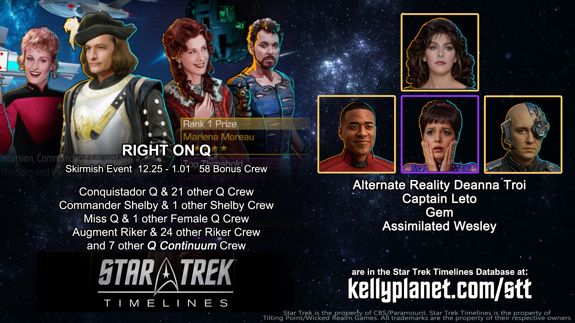 Skirmish Event: RIGHT ON Q 12.25 – 01.01 | 58 Bonus Crew – see them all at https://kellyplanet.com/star-trek-timelines/event-bonus-crew : Conquistador Q & 21 other Q Crew | Commander Shelby & 1 other Shelby Crew | Miss Q & 1 other Female Q Crew | Augment Riker & 24 other Riker Crew | and 7 other Q Continuum Crew.