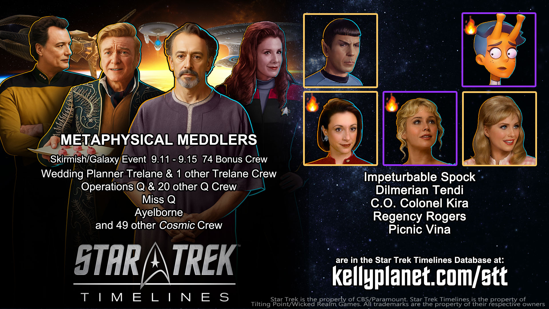 Skirmish/Galaxy Event: METAPHYSICAL MEDDLERS 9.11 – 9.15 | 74 Bonus Crew – see them all at https://kellyplanet.com/star-trek-timelines/event-bonus-crew : Wedding Planner Trelane & 1 other Trelane Crew | Operations Q & 20 other Q Crew | Miss Q | Ayelborne | and 49 other Cosmic Crew.