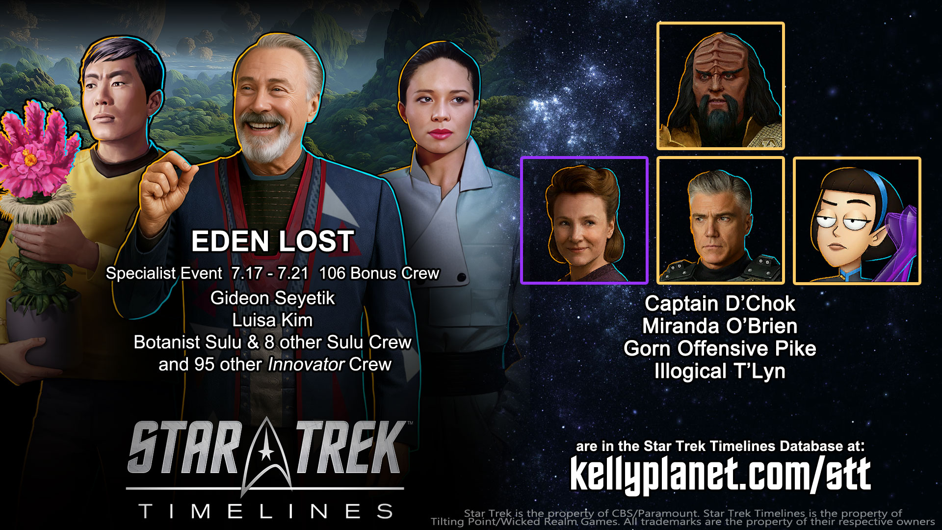 Specialist Event: EDEN LOST 7.17 – 7.21 | 106 Bonus Crew – see them all at https://kellyplanet.com/star-trek-timelines/event-bonus-crew : Gideon Seyetik | Luisa Kim | Botanist Sulu & 8 other Sulu Crew | 95 other Innovator Crew