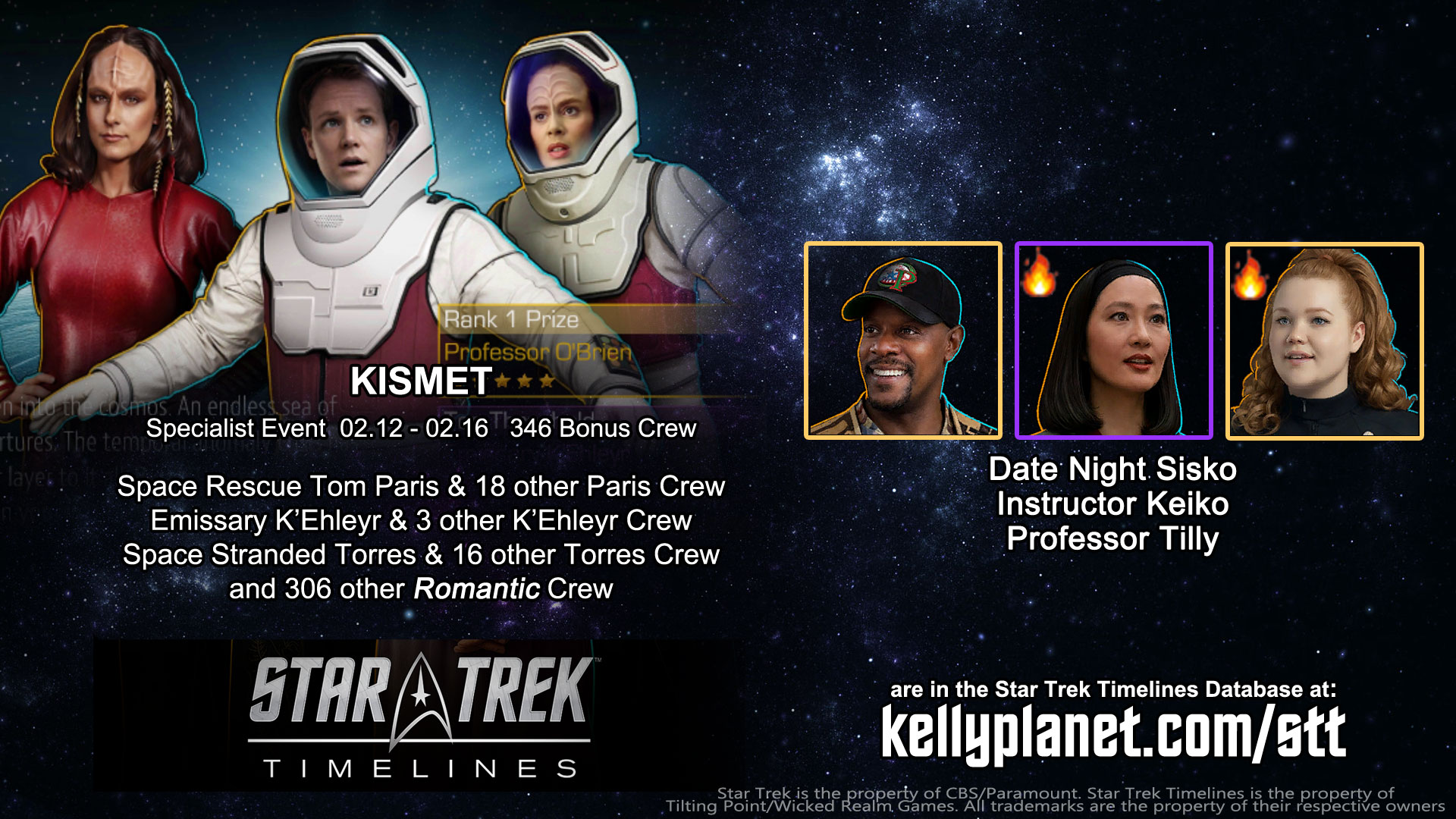 Specialist Event: KISMET | 02.12 – 02.16 | 346 Bonus Crew – see them all at https://kellyplanet.com/star-trek-timelines/event-bonus-crew : Space Rescue Tom Paris & 18 other Paris Crew | Emissary K’Ehleyr & 3 other K’Ehleyr Crew | Space Stranded Torres & 16 other Torres Crew