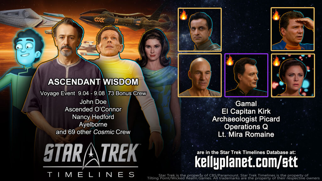 Voyage Event: ASCENDANT WISDOM 9.04 – 9.08 | 73 Bonus Crew – see them all at https://kellyplanet.com/star-trek-timelines/event-bonus-crew : John Doe | Ascended O’Connor | Nancy Hedford | Ayelborne | and 69 other Cosmic Crew.